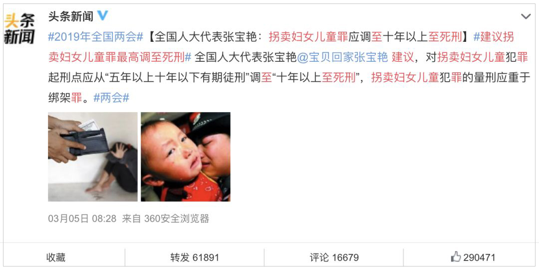 今年3月,微博話題#建議拐賣婦女兒童罪最高調(diào)至死刑#火了,一條微博就收到了網(wǎng)友們將近30萬(wàn)的點(diǎn)贊。