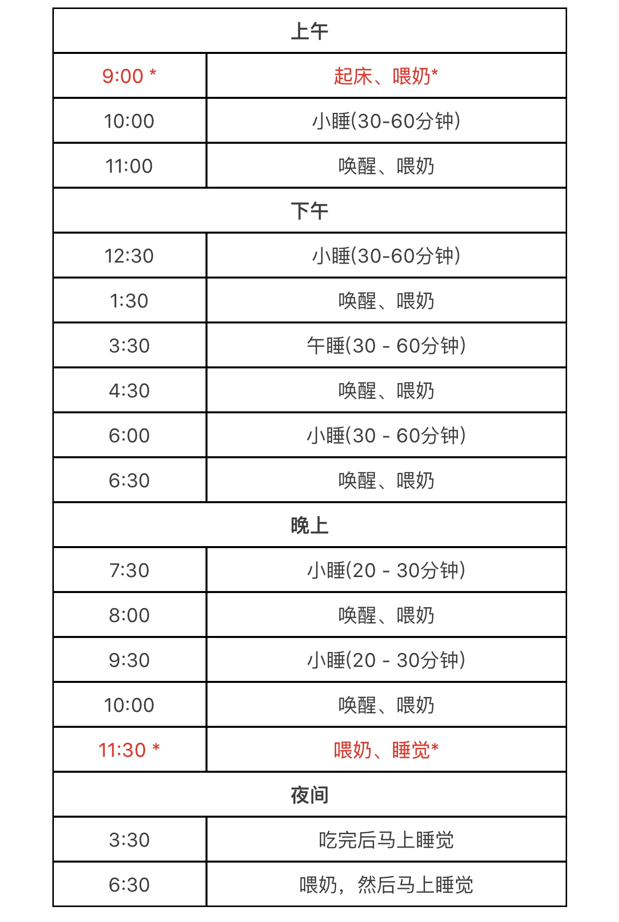 (這個時間表適合平均吃奶量的嬰兒,以及平均產奶量的媽媽,嬰兒吃的量較少,有反流的嬰兒,以及母乳不夠的媽媽需要不同的時間表。)