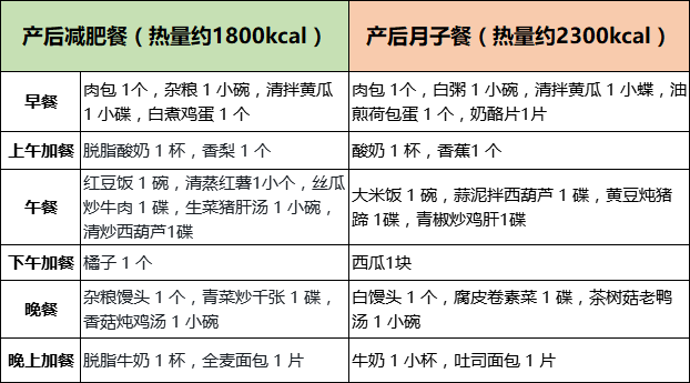 左邊是滿足每日基本能量攝入1800千卡的減肥食譜,右邊呢就是正常的月子餐。