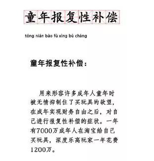 它用來形容許多成年人因為童年時買玩具的欲望被無情地壓抑住了,當成年實現(xiàn)財務自由后對自己進行報復性補償?shù)男袨椤?/span>